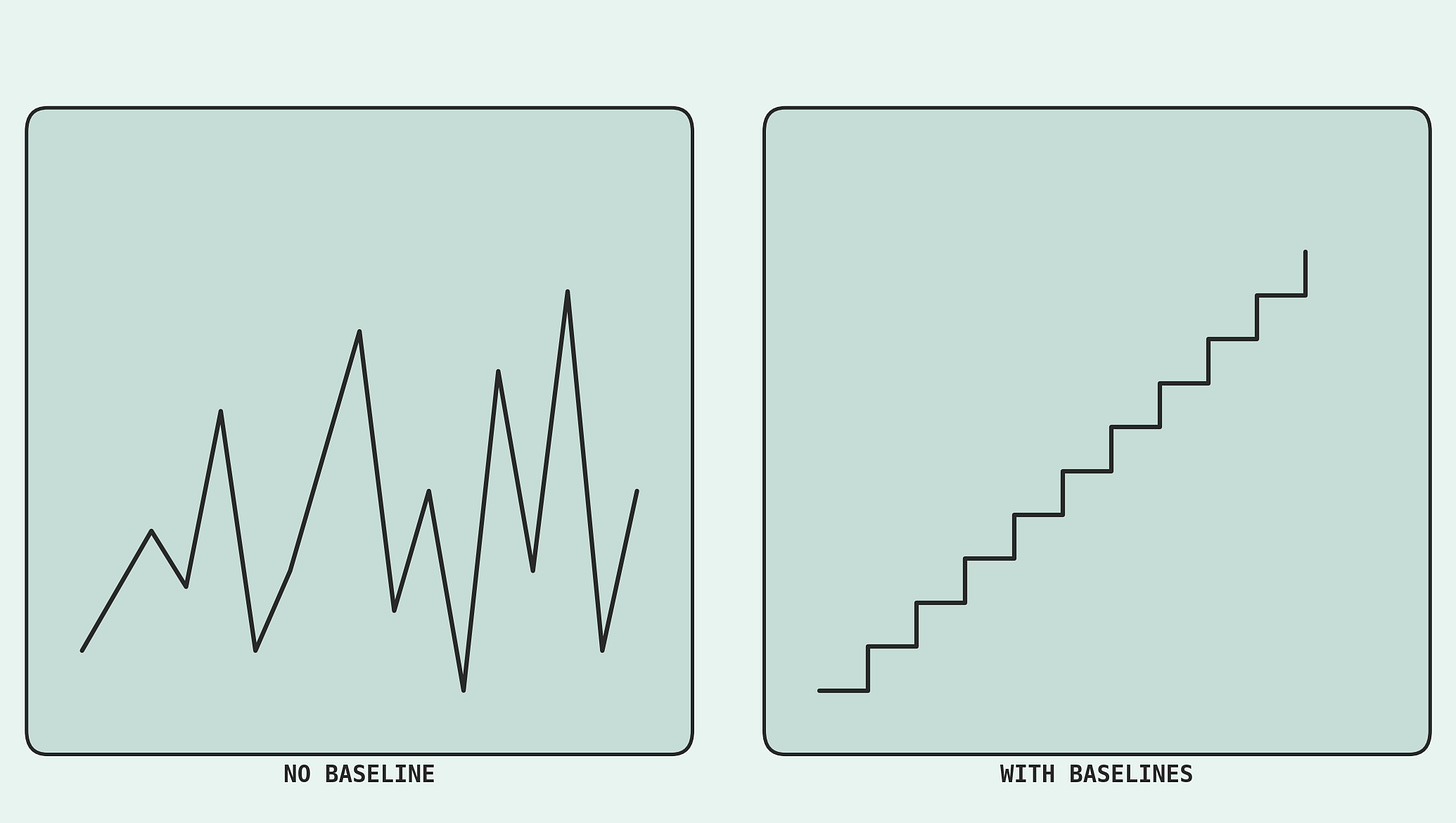 The lowest baseline was just about keeping my tyres inflated. Everything above that was a bonus, which made some days feel incredible while also ensuring the worst days were manageable. Based on how I felt on any given day and what my schedule looked like, I had bigger or harder tasks that I could reach for that I’d refer to as my ‘good day’ and ‘ideal day’ baselines.